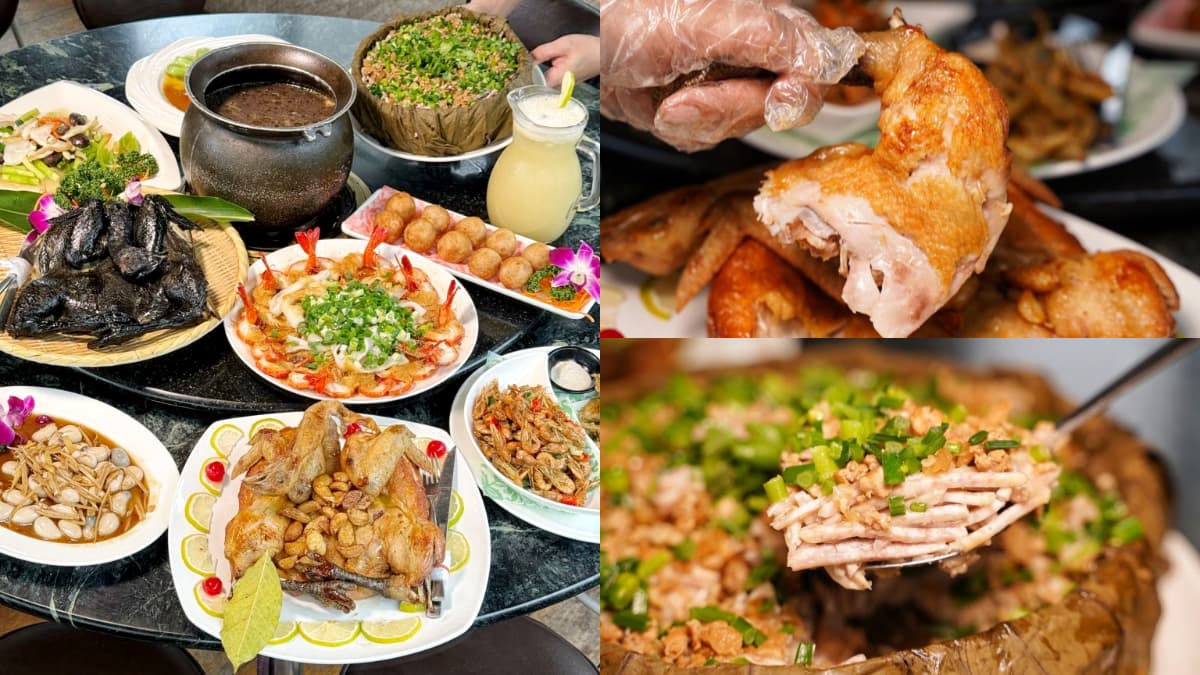菜單光是雞肉料理就有近30種選擇,首先推薦老饕必點的「招牌雞」(780元,全隻),想吃要提前預訂,因為料理過程需要50分鐘,金黃誘人的烤雞搭配炸蒜頭上桌,香氣四溢。「鹽焗烏骨雞」(820元,全隻)透過鹽烤的方式鎖住肉汁,皮Q肉嫩,肉質甜美,同樣是鎮店招牌料理!雞湯的口味眾多,有香菇雞、蒜頭雞、剝皮辣椒雞、鳳梨苦瓜雞等多種口味,老饕則推薦這道珍補聖品「雞仔豬肚鱉湯」(1,200元),整鍋滿滿都是料,湯頭散發濃郁的中藥香氣及淡淡酒香,入喉還會回甘,營養滿滿。