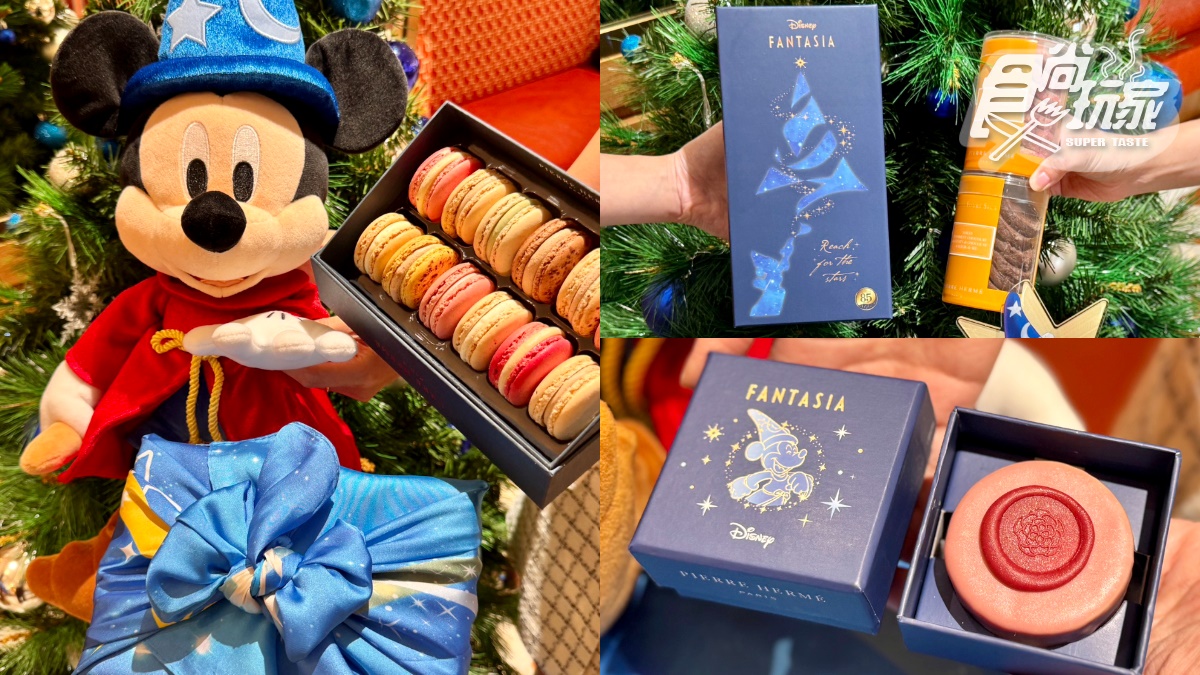 法國最火「精品馬卡龍」品牌PIERRE HERMÉ PARIS,在今年聖誕首度與迪士尼合作《幻想曲 Fantasia》85週年系列,以米奇在〈魔法師的學徒〉中的經典形象為靈感,禮盒設計選用深藍星夜為主調,搭配流動的燙金線條,商品涵蓋馬卡龍、常溫餅乾與果醬禮盒。迪士尼公關也搶先與《食尚玩家》記者透露,2026年還會緊接著有新年系列登場,屆時不只是禮盒,杯款、周邊也都正在規畫中,迪士尼控可以好好期待一下。