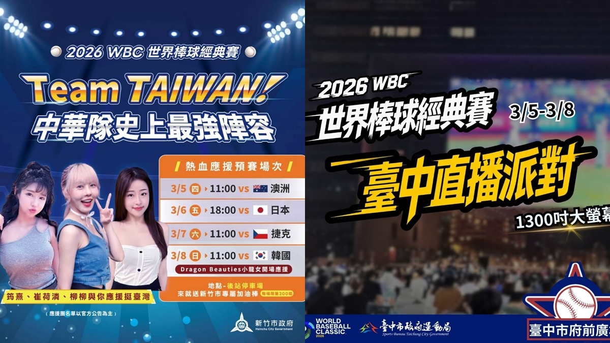 棒球魂真的燃燒啦!2026世界棒球經典賽(WBC)開打,台灣隊在東京巨蛋硬碰日本、南韓、澳洲、捷克,目標直指美國複賽!雖然不能飛東京應援,但熱血不能輸!這次全台20縣市都準備了超大螢幕戶外轉播,還有啦啦隊女神、抽機票、免費美食等好康。小編已經幫大家把全台各地的「戰區」資訊整理好了,快分享給朋友,今年春天就是要一起吶喊!下載食尚APP,天天免費抽大獎!